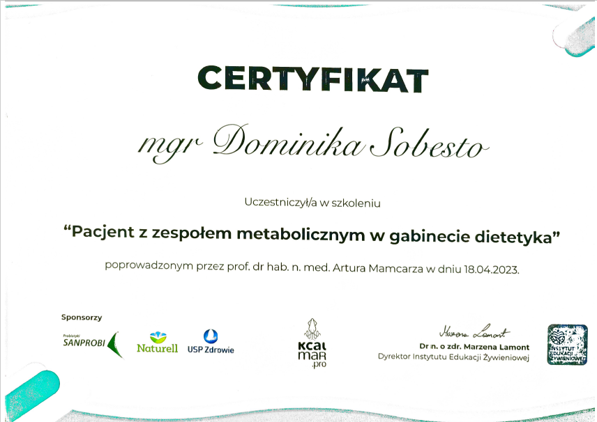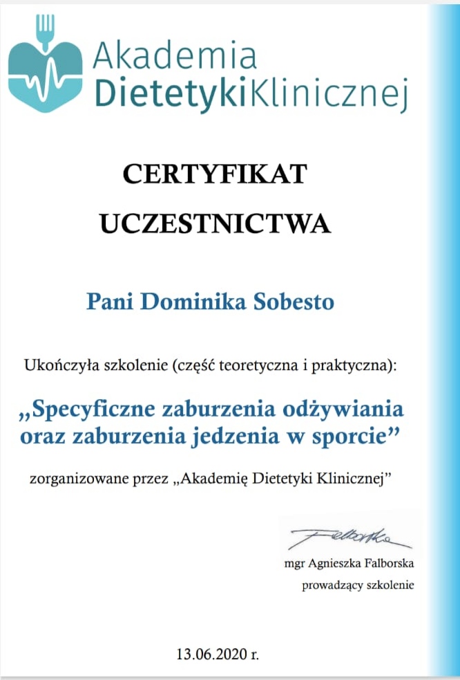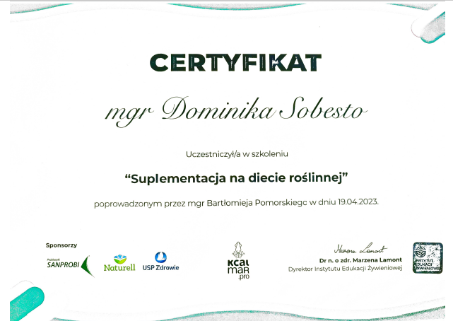 Potwierdzenie wiedzy, doświadczenia i nieustannego rozwoju. Moje certyfikaty to dowód na zaangażowanie w dostarczanie rzetelnych i skutecznych rozwiązań dietetycznych.